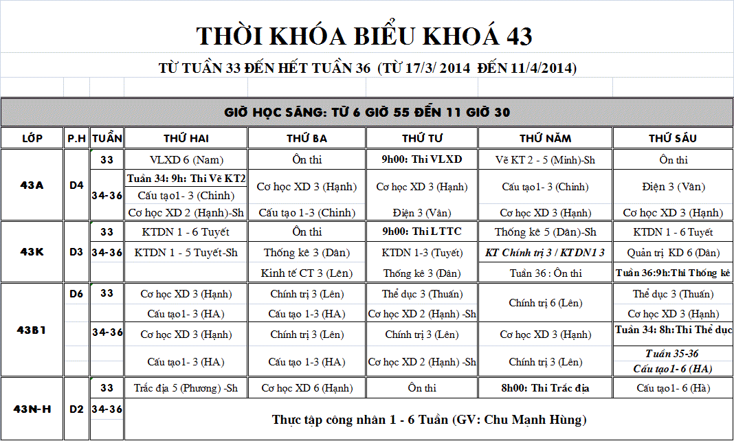 TKB khóa 43 Tuần 33 - 36