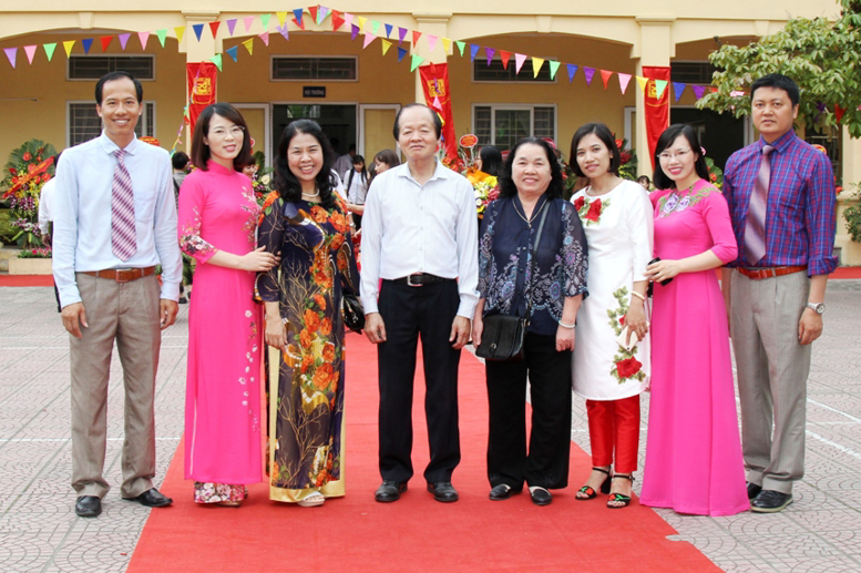 Các đồng chí lãnh đạo cấp trên chụp ảnh lưu niệm cùng tập thể lãnh đạo nhà trường