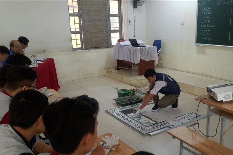 - Thầy giáo Mai Xuân Định, phòng Thực hành sản xuất với bài giảng: " Lát gạch trang trí có mỏ sẵn bằng phương pháp dán keo" của môn học Thực hành tay nghề cơ bản.