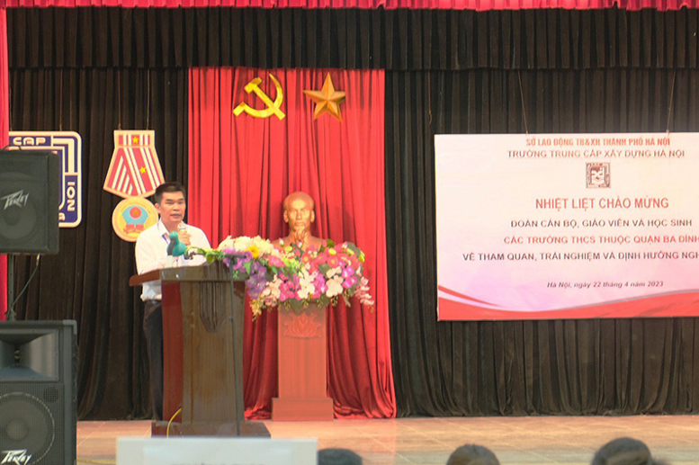 Thầy giáo Hiệu trưởng phát biểu chào mừng và giới thiệu về Trường Trung cấp Xây dựng Hà Nội